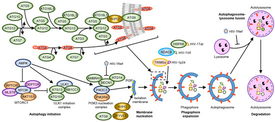 The initiation of autophagy is a multistep process. The main regulators of autophagy are MTOR, an inhibitor, and AMP-activated kinase (AMPK) an activator. MTORC1 inhibition induces autophagy through the formation of the ULK1 complex. This complex initiates the formation of the phagophore by directly activating the phosphatidylinositol 3-kinase catalytic subunit type 3 complex I (PIK3C3 complex). The PIK3C3 complex translocates to endoplasmic reticulum sites and produces phosphatidylinositol 3-phosphate (PI3P) which then recruits PI3P-binding proteins such as WIPI2 and ZFYVE1. HIV-1 Nef can inhibit this process by enhancing the association between BECN1 and its inhibitor BCL2. In the ATG12 conjugation system, ATG12 forms a covalent bond with ATG5, which then binds ATG16L1, followed by dimerization (not shown) and interaction with the PI3P-binding complex. The WIPI2b isoform acts immediately upstream of ATG16L1 and recruits ATG12–ATG5-ATG16L1 to PI3P-containing phagophores. The ATG12–ATG5-ATG16L1 complex then promotes conjugation of ATG8 family proteins with phosphatidylethanolamine (PE), which are then incorporated into phagophore membranes, where they interact with cargo receptors harbouring LC3-interacting motifs. ATG16L1, as well as the polyubiquitin-binding autophagy receptors including SQSTM1, OPTN, NBR1, and NDP52 also recruit and incorporate ubiquitin-decorated cargos into autophagosomes including HIV-1 Tat, HIV-1 Vif, and HIV-1 p24. After detachment of ATG factors, the isolation membrane closes through membrane scission, forming the autophagosome. These, then, fuse with lysosomes resulting in the degradation of the engulfed components as well as the ATG8-PE and SQSTM1 associated with the inner membrane. HIV-1 Nef affects autophagosome maturation by preventing the fusion between autophagosomes and lysosomes.