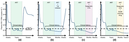 - Aguilera, L.U.; Rodríguez-González, J. Modeling the effect of tat inhibitors on HIV latency. J. Theor. Biol. 2019, 473, 20–27. [Google Scholar] [CrossRef]