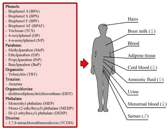 Xenoestrogens in human tissues. Xenoestrogens are absorbed into the human body via digestion, inhalation and transdermal absorption. Compounds were detected in human hairs, breast milk, blood, adipose tissue, cord blood, amniotic fluid, urine, menstrual blood, and semen [13,14,15,16,17,18,19].