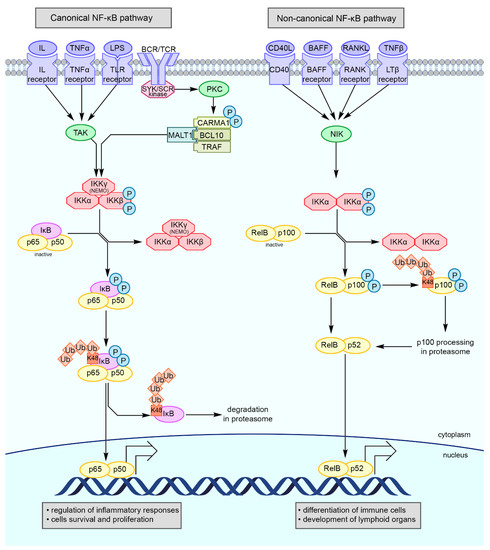 Schematic overview of the canonical (classical) and non-canonical (alternative) NF-κB signaling pathways. Activation of the canonical cascade of NF-κB requires signal transmission via membrane receptors and activation of IKK complex containing NEMO. IKK phosphorylates IκB inhibitor, which is binding NF-κB dimers: p65 and p50. K48-linked polyubiquitination leads to proteasomal degradation of the phosho-IκB, whereas K63-linked polyubiquitin is responsible for stabilizing the membrane receptor signalosome, enable recruitment of downstream adaptors or complexes, and activating kinases. Released NF-κB dimers are translocated into the cell nucleus and regulate transcription of genes. Non-canonical NF-κB pathway is dependent on activation NIK and IKKα complex. The NF-κB dimers remain inactive until IKKα complex phosphorylates p100. Phosphorylation and K48-linked polyubiquitination of p100 cause its proteasome processing which leads to forming p52 subunit. RelB and p52 NF-κB dimers are translocated into the cell nucleus and act as a transcription factor. Abbreviations: BAFF—B-cell activating factor; CD40L—cluster of differentiation 40 ligand; IKK—IκB kinase; IL—interleukin; K48/K63—lysine 48/63; LPS—lipopolysaccharide; LTβ receptor—lymphotoxin β-receptor; NF-κB—nuclear factor κB; NIK—NF-κB-inducing kinase; P—phosphorylation; RANK—receptor activator of nuclear factor kappa-Β; RANKL—receptor activator of nuclear factor kappa-Β ligand; TAKTGF-β-activating kinase; TLR receptor—Toll-like receptor; TNFα/β—tumor necrosis factor α/β; Ub—ubiquitination [75,76,77,78,79,80,81].