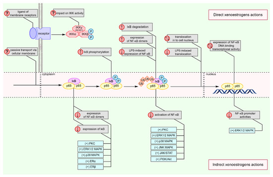 The abovementioned disorders result from complex reactions that are mainly related to the malfunction of immune cells. All the intracellular processes are controlled by a network of messenger proteins which are grouped into signaling pathways. Due to their complexity and possible interactions, these signaling pathways create an intracellular signaling network. Among the intracellular pathways in immune cells, NF-κB is especially considered important as it regulates over 200 genes, including those responsible for the production of cytokines, generation of reactive oxygen and nitrogen species, as well as degranulation and maturation of cells. Moreover, the expression of this transcription factor is regulated by both endogenous (e.g., estrogen hormones) and exogenous (e.g., XEs) factors.