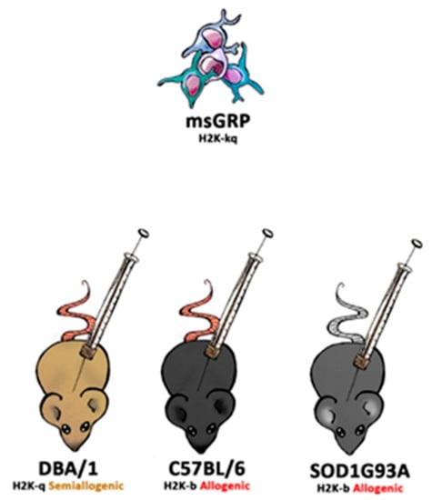 In this study, we tried to assess the potential immunogenicity of murine glial restricted progenitors (GRPs) transplanted directly into cisterna magna of ALS B6SJL-Tg(SOD1*G93A)1Gur/J male mouse model and involvement of neuroimmune response to GRPs administration in semiallogeneic (DBA1/J), allogeneic (C57BL/6), and immunodeficient (SCID) male mouse model. Neuroimmune response to GRPs was studied under immunosuppressive (Tacrolimus or CTLA-4 MR1 co-stimulatory blockade) and immunomodulatory (preimplantation factor) protocols [15,16].