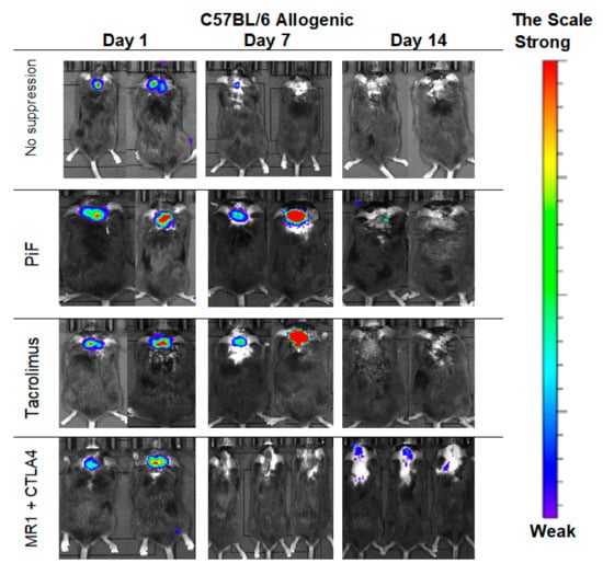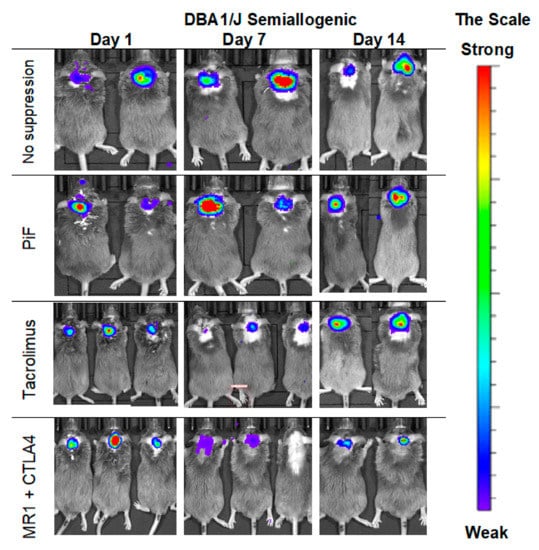 The observations performed in the allogeneic C57BL/6 mouse model (Figure 6) showed that, after 7 days post-transplantation, the strongest signals were revealed in PiF- and Tacrolimus-applied groups of mice. The signals obtained on day 7 for the immunosuppression-free group and co-stimulatory blockade group were detectable. Surprisingly, after 14 days post-transplantation, the strongest signal occurred in a co-stimulatory blockade group.