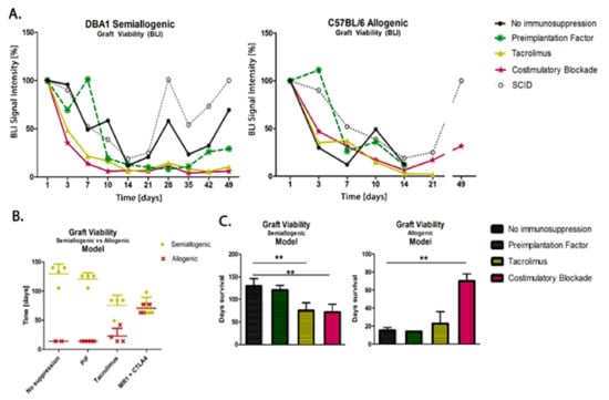 Comparison of graft survival in semiallogenic DBA1 and allogenic C57BL/6 mouse models: (A) Graphic presentation of GRP graft viability (presented as the proportion out of initial BLI as 100% of intensity signal) transplanted into healthy models in semiallogenic (left) and allogenic (right) combinations. (B) Graphic presentation of cellular graft viability in semiallogenic (yellow dots) and allogenic (red crosses) mouse models after performed GRP transplantation. The murine GRP graft survived well in semiallogenic mice even if no immunosuppression was applied. The graft survival in the allogenic model was the longest and comparable to the semiallogenic model after the co-stimulatory molecules blockade. (C) Bar graphics of graft survival in semiallogenic mouse model (right) as compared with different groups of immunosuppressive/immunomodulatory regimens (** p < 0.005). Unpaired Student’s t-test; data are presented as median, error bars: SD; the total number of biological replicates per group = 4–5. Abbreviations: BLI-bioluminescence imaging; GRP-glial-restricted progenitor cell.