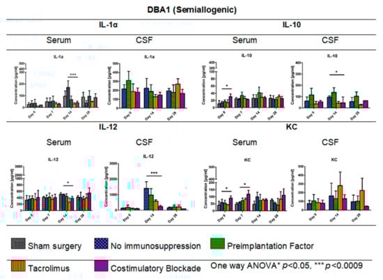 Cytokine levels in serum and CSF of DBA1 semiallogenic model: IL-1α, IL-10, IL12, and KC levels in serum and CSF samples were measured in semiallogenic DBA1 mice. There were significant differences between variants of the immunomodulatory regime in the level of IL-1α observed on day 14 (p < 0.0009). Significant differences were also found between the studied variants in serum samples for IL-10 (day 0, p < 0.05), IL-12 (day 14, p < 0.05), and KC levels (days: 0 and 7, p < 0.05). Significant differences in cytokine level in CSF were observed for IL-10 (p < 0.05) and IL-12 (p < 0.0009) on day 14 post-transplantation. Unpaired Student’s t-test; data are presented as mean, error bars: SD; the total number of samples: n = 77, total number per variant at each time point: n = 3–5. The total number of biological replicates per group: n = 5. Abbreviations: CSF-cerebrospinal fluid.