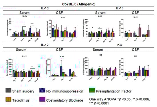 In Figure 9, IL-1α, IL-10, IL-12, and KC levels in serum (days: 0, 7, 14, 28 post-transplantation) and CSF samples (days: 0, 7, 14 post-transplantation) for the allogeneic C57BL/6 mouse model are presented. The lowest IL-1α level in the C57BL/6 allogenic model was detected in serum in variants in which Tacrolimus and co-stimulatory blockade were applied. Interestingly, on day 14, the IL-1α level decreased in variants in which PiF (46.41 pg/mL) was applied, and this was comparable to the levels obtained for Tacrolimus (41.89 pg/mL) and co-stimulatory blockade groups (45.52 pg/mL). The highest overall IL-1α level was found in the group with no immunosuppression applied, and the highest concentrations were obtained on day 14 post-transplantation (124.04 pg/mL, one-way ANOVA p < 0.0001). There were no significant differences in concentration levels of IL-1α in CSF samples; however, overall concentrations decreased with the observation time, except for the co-stimulatory blockade variant, in which concentrations between days 14 and 28 were similar. The lowest level of IL-10 was found in the serum in the variant where no immunosuppression was exerted (17.12–27.35 pg/mL) and the variant with Tacrolimus (22.08–39.70 pg/mL). The highest level of anti-inflammatory IL-10 was detected in serum in PiF (33.93–39.60 pg/mL) and co-stimulatory blockade variants (27.33–44.59 pg/mL). The overall concentration of IL-10 was the highest in the co-stimulatory blockade variant and increased with time post-transplantation. Significant differences were observed on days 0 and 7 in IL-10 serum concentrations between variants applied (one-way ANOVA, p < 0.05). There were no significant differences calculated for IL-10 concentration in CSF samples at any time point; however, the highest concentration, in general, was found in a co-stimulatory blockade group (91.18–215.51 pg/mL) and the lowest in the Tacrolimus group (12.71–91.57 pg/mL). The concentration of IL-12 in serum was rather stable when compared between variants applied at day 0 and 7 post-transplantation; however, at day 14 and 28 post-transplantation, there were statistically significant differences (one-way ANOVA p < 0.006 and p < 0.05, respectively). The lowest concentration of IL-12 in serum was detected in Tacrolimus and co-stimulatory blockade variants at day 14 (316.99 pg/mL and 343.52 pg/mL, respectively) and the highest in the PiF variant (455.98 pg/mL). IL-12 level on day 28 in the Tacrolimus group increased up to 482.63 pg/mL. In CSF samples, the concentration of IL-12 was found to be increased at days 7 and 14 post-transplantation and was the highest in the group with no immunosuppression applied (1297.36–1723.86 pg/mL). There were no significant differences in KC levels in serum between the variants under study; however, the highest level could be observed on days 0 and 7 in the PiF variant and days 14 and 28 in the co-stimulatory blockade variant. In the CSF samples on day 7 post-transplantation, KC level increased in the immunosuppression-free group and co-stimulatory blockade variant and was just slightly changed in the PiF and Tacrolimus variants (mice groups). KC levels increased on day 14 with no immunosuppression, PiF, and Tacrolimus variants; however, no significant differences were found.