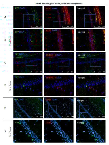 Immunohistochemical staining (Figure 10) performed in the DBA1 semiallogenic mouse model after 140 days of observation confirmed the results performed with the BLI method. In the brains of animals that accepted the GRPs’ graft, numerous cells positive for staining with anti-GFP antibody (green) were found. The GFP staining was performed because of the risk of losing fluorescent signal after all tissue preparation procedures. Additional stainings for the presence of immunocompetent cells of an innate immune response, like microglial cells (TMEM119+) or the presence of the MCP-1, were also performed. The GFP+ cells were present in the whole hippocampus, but mostly in regio superior in the semiallogenic DBA1 mouse model. They were localized in the niche close to activated TMEM119+ microglial cells (Figure 10C,D) as well as MCP-1 positive cells (Figure 10A,B). This observation suggests that TMEM119+ and MCP-1+ cells did not struggle with the transplanted GRPs. No CD45+ cells were present in the area (Figure 10E,F).