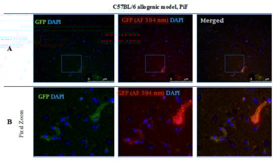 Post-mortem evaluation of GRPs’ graft localization. Immunohistochemical staining in the brain of C57BL/6 (allogeneic) mouse model after 14 days of observation in the group where PiF was applied: The GFP+ cells (green) were observed in the midbrain tissue. We used an anti-GFP antibody (secondary antibody pertaining to red fluorescence Alexa Fluor 594 nm, Abcam, Cambridge, UK) to assess if the signal is specific (A,B). Abbreviations: GFP-green fluorescent protein; GRP-glial-restricted progenitor cell; PiF-preimplantation factor.