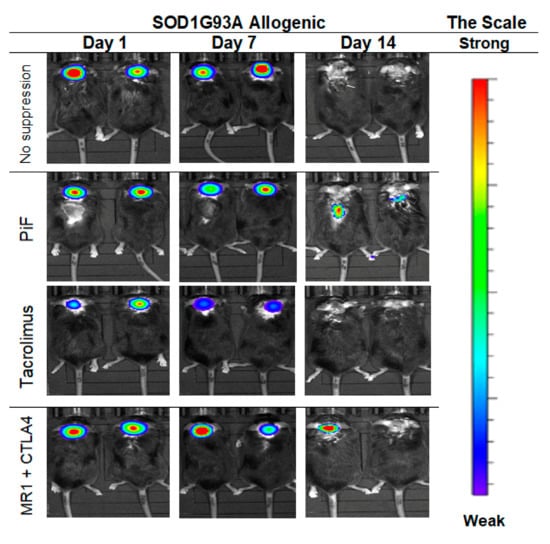 The cellular graft containing GRPs was transplanted into 10-week old male SODG93A mice with immunosuppressive or immunomodulatory protocols introduced as described previously with or without immunosuppression. The graft was visible from day 1 to day 7 in the group with no immunosuppression, but the signal disappeared on day 14 from GRPs’ delivery. Similar results were seen after PiF application; however, the visible signal on day 14 in a spine region was still detected. Graft survival was poorly visible in the Tacrolimus variant, in which the BLI signal was weaker on day 7 as compared with the other groups and not detectable on day 14. Satisfactory GRPs’ graft survival was observed in the variant in which co-stimulatory blockade was applied (Figure 13).