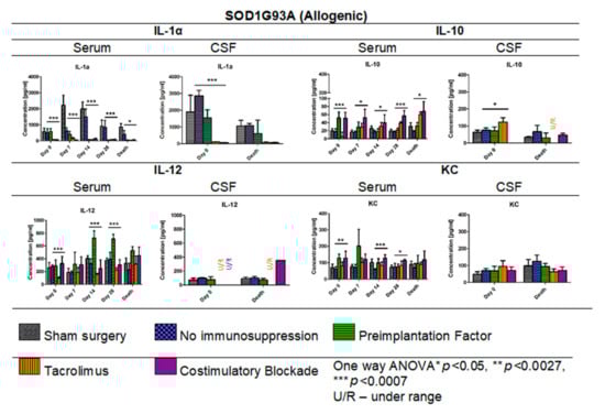 Cytokine levels in serum and CSF samples in ALS SOD1G93A allogenic mouse model: IL-1α, IL-10, IL-12, and KC levels in serum and CSF samples were measured in allogenic ALS SOD1G93A mice. There was a striking difference in IL-1α levels in no immunosuppression and sham surgery variants and variants in which immunosuppressive versus immunomodulatory regimens were applied. Significant differences were also seen in IL-10, IL-12, and KC levels in serum samples and IL-1α and IL-10 levels in CSF samples on day 0. No significant differences were found in IL-12 and KC levels in the course of observations. Moreover, no significant differences on the day of termination for IL-1α and IL-10 levels were found. However, it is worth emphasizing that the levels of IL-10 and IL-12 in the Tacrolimus and co-stimulatory groups were undetectable in CSF. Information about other cytokines levels from the 23-cytokine mouse panel is accessible in Supplementary Figures S1–S3. Unpaired Student’s t-test; data are presented as mean, error bars: SD; the total number of samples: n = 101, total number per variant at each time point: n = 2–6. The total number of biological replicates per group: n = 6. Abbreviations: ALS-amyotrophic lateral sclerosis; CSF-cerebrospinal fluid.