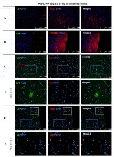 Based on immunofluorescence staining in ALS SOD1G93A mice, the disappearance of transplanted GRP cells was confirmed after 56 days post-transplantation in the immunosuppression-free group (Figure 15). Single GFP+ cells were visible in the brain parenchyma; however, immune cell infiltration was also observed, which indicates ongoing inflammation in the tissue. As presented in Figure 15A, there was visible elevated MCP-1+ cell expression in brain tissue as well microglia activation, which was confirmed by expression of TMEM 119+ (Figure 15B). Infiltration of scattered CD45+ T cells was observed-mostly in the area of cerebellum and brainstem and medulla oblongata (Figure 15E–G).