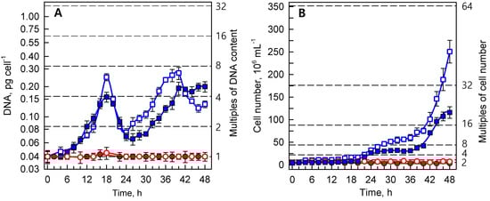 The course of reproductive events in the synchronized cultures of Parachlorella kessleri grown at temperatures of 30 °C and 40 °C (blue and red symbols and lines, respectively), and at incident light intensities of 500 and 110 μmol photons m−2 s−1 (empty and full symbols, respectively). (A) DNA (pg cell−1), and (B) cell number (106 mL−1). Horizontal dashed lines indicate the number of doublings of the initial values at the beginning of the cell cycle (0 h). Multiples of these values are given on the right ordinate. Data are presented as means ± SE. The differences between 30 °C and 40 °C are statistically significant at p < 0.001 (two-way ANOVA) in both A and B.