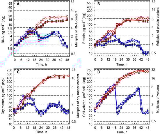 Time course of growth events in synchronized cultures of Parachlorella kessleri grown at 30 °C and 40 °C (blue and red symbols and lines, respectively), and at incident light intensities of 500 and 110 μmol photons m−2 s−1 (empty and full symbols, respectively). (A) RNA (pg cell−1), (B) protein (pg cell−1), (C) dry matter (pg cell−1), and (D) cell volume (μm3 cell−1). Horizontal dashed lines indicate the number of doublings of the initial values at the beginning of the cell cycle (0 h). Multiples of these values are given at right ordinate. Data are presented as means ± SE. The differences between 30 °C and 40 °C are statistically significant at p < 0.001 (two-way ANOVA) in both A and B.