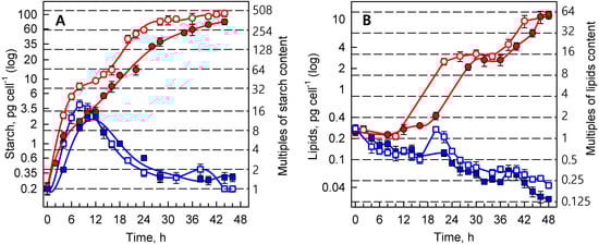 The course of changes in energy reserves in synchronized cultures of Parachlorella kessleri at temperatures of 30 °C and 40 °C (blue and red symbols and lines, respectively), and at incident light intensities of 500 and 110 μmol photons m−2 s−1(empty and full symbols, respectively). (A) Starch (pg cell−1), and (B) lipids (pg cell−1). Horizontal dashed lines indicate the number of doublings of the initial values at the beginning of the cell cycle (0 h). Multiples of these values are given on the right ordinate. Data are presented as means ± SE. The differences between 30 °C and 40 °C are statistically significant at p < 0.001 (two-way ANOVA) in both A and B. The differences between different light intensities in A are statistically significant at p < 0.05 (two-way ANOVA).