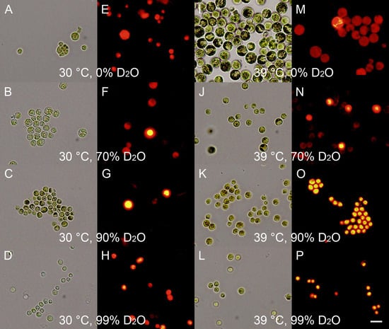Light and fluorescence photomicrographs of synchronized cultures of Parachlorella kessleri grown for 24 h at an incident light intensity of 110 μmol photons m −2 s −1, temperatures of 30 °C and 39 °C, and different concentrations of deuterated water in the media (0, 70, 90, and 99%). (A,E,I,M) control cultures grown in 0% D2O, (B,F,J,N) cultures grown in 70% D2O, (C,G,K,O) cultures grown in 90% D2O, and (D,H,L,P) cultures grown in 99% D2O. In (A–D) and (I–L) the cells were stained with Lugol’s solution to visualize starch; for (E–H) and (M–P) the cells were stained with Nile red to visualize neutral lipids. Scale is 10 μm.