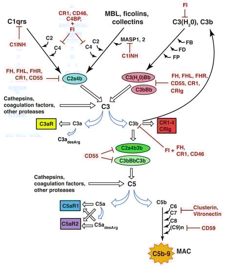 As mentioned above, the constitutive mode of activation together with the huge amplification power of the alternative pathway pose potential danger to the host cells and thus demand strict spatiotemporal control of the active components, convertases, as well as the membrane attack complex. The protection of host cells from the bystander effect of C3b deposition is achieved by fluid-phase regulators such as factor H, factor H-like protein, complement factor H-related proteins 2 and 4, and C4-binding protein, which all facilitate the decay of the C3 convertases. In addition, factor I is a serine protease that degrades cofactor bound C3b and C4b, C1-inhibitor inhibits serine proteases including those with complement-activating properties. Membrane-bound CR1 (CD35) and decay accelerating factor (CD55) facilitate the decay of the C3 convertases. CD46 and CR1 act as cofactors for factor I-mediated proteolytic degradation of C4b, C3b and their fragments. The formation of membrane attack complex on host cells is inhibited by fluid-phase clusterin and vitronectin, and the membrane-bound CD59. The biological activity and potency of C3a and C5a is controlled through the removal of C-terminal arginine residue by carboxypeptidases generating C3adesArg and C5adesArg, respectively, []), Figure 1.