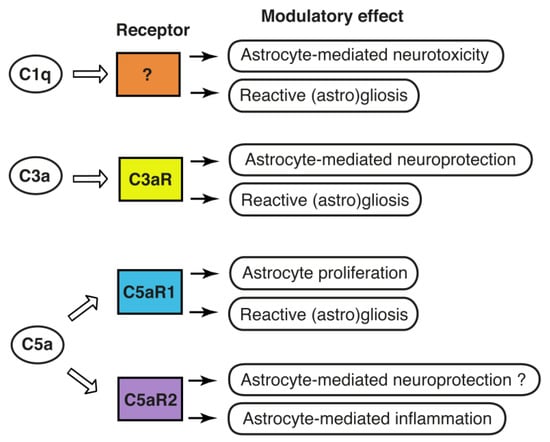 Complement is a modulator of astrocyte function: known and putative effects of the complement components C1q, C3 and C5 on astrocytes. While there are several potential candidates, the specific receptor through which C1q exerts its modulatory effects on astrocytes is currently unknown. C3a and C5a exert their modulatory effects through C3aR, C5aR1 and C5aR2.