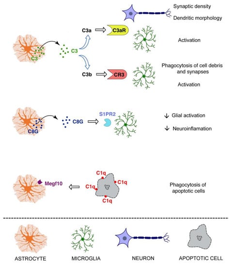 The reciprocal signaling between astrocytes and microglia, the resident immune cells of the CNS, appears to play a critical role in determining the reactive astrocyte phenotype. Astrocytes express C3aR [,,], C5aR1 [,,], C5aR2 [], and CR3 [], as well as Megf10, a phagocytic receptor that can also bind C1q []. gC1qR, a receptor for the globular domain of C1q, with a potential role in phagocytosis, and cC1qR/calreticulin which binds the collagen domain of C1q [], were reported to be expressed on human astrocytes [] and on rat astrocytes [], respectively. CD91/low-density lipoprotein receptor-related protein, is a multi-scavenger receptor that was shown to directly interact with C1q for clearance of C1q and C1q-bound material [], and is expressed by multiple cell types including astrocytes []. CD93 is another C1q binding phagocytic receptor that is expressed by neural stem cells and neurons []. CD93 negatively regulates astrogenesis in the developing brain but does not seem to be expressed by mature astrocytes []. Human astrocytes were reported to also express CR1 and CR2 [,]. Given their broad expression of receptors for complement proteins and their activation products, it is therefore not surprising that the complement system has emerged as an important factor in the cross-talk between microglia and astrocytes, Figure 2.