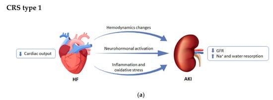 Faced with a drop in blood pressure levels due to the development of heart failure (HF), the kidney responds to the decrease in cardiac output by retaining sodium and water. Nevertheless, it has been demonstrated that an elevation of the central venous pressure can result in impairment of renal function and congestion of the kidneys [,]. In this context, neurohormonal activation through the Renin–Angiotensin–Aldosterone System (RAAS) also has an important role, as it is both an initially compensatory mechanism for the decrease in volume consequence of the ventricular injury, and a long-term initiator of cardiovascular and renal dysfunction [,]. Other non-hemodynamic mechanisms, such as inflammation and oxidative stress, have been established as common pathways for cellular dysfunction in heart and kidney failure [,,,].