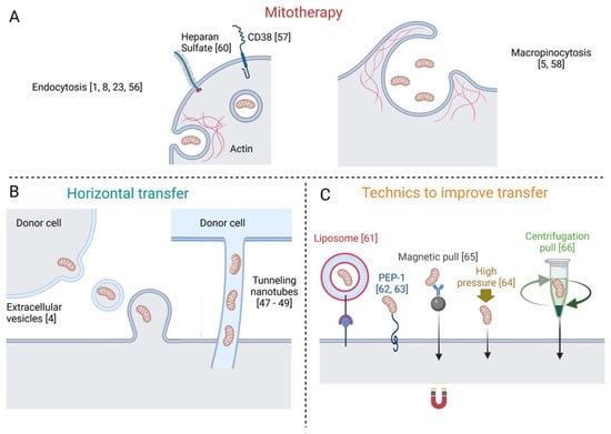 Reported mechanisms and relevant references of mitochondria internalization. Representation of the mechanisms of mitochondria internalization described in mitotherapy (A). Mechanisms involved in horizontal transfer of mitochondria (B). Technics developed to improve exogenous mitochondria internalization (C).