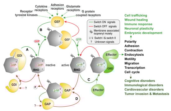 The RHO (RAS homolog) family is an integral part of the RAS superfamily of guanine nucleotide-binding proteins. RHO family proteins are crucial for several reasons: (i) approximately 1% of the human genome encodes proteins that either regulate or are regulated by direct interaction with RHO proteins; (ii) they control almost all fundamental cellular processes in eukaryotes including morphogenesis, polarity, movement, cell division, gene expression, and cytoskeleton reorganization [1]; and (iii) they are associated with a series of human diseases (Figure 1) [2].