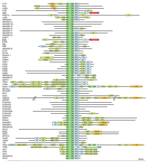 Through a search for DH domain-containing proteins in the human genome, 74 DBL proteins have been identified (Figure 3) [47]. Interestingly, nine of these DBL proteins lack the C-terminal tandem PH domain, and three of these proteins contain a membrane bending and tubulating BAR (BIN/amphiphysin/RVS) domain, and seven of 20 investigated DBL proteins do not exhibit any GEF activity (Figure 3) [47]. In addition to the DH-PH tandem motif, DBL family proteins are highly diverse and contain additional domains with different functions (Figure 3) including SH2, SH3, CH, RGS, PDZ, and/or IQ domains, which enable their interaction with other proteins; BAR, PH FYVE, C1, and C2 domains, which enable their interaction with membrane lipids; and other functional domains such as Ser/Thr kinase, RASGEF, RHOGAP, and RANGEF [82]. These additional domains have been implicated in autoregulation, subcellular localization, and connection to upstream signaling molecules [40,49,50]. Spatiotemporal regulation of DBL proteins has been suggested as a mechanism that specifically initiates the activation of substrate RHO proteins and controls a broad spectrum of normal and pathological cellular functions [89]. Thus, it is evident that members of the DBL protein family are attractive therapeutic targets for a variety of diseases [90,91].