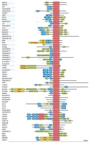 Domain organization of the RHOGAP family proteins (adapted from Amin et al., 2016 [114]. RHOGAPs are mostly multimodular proteins and have a number of functional domains that may mediate cross talk between RHO proteins and other signaling pathways. Functional domains, in addition to the catalytic GAP domain (red), are probably involved in lipid and membrane binding (blue), protein interactions (bright green), and enzymatic activities (red and orange). A scale of amino acid numbers in increments of 200 is shown at the bottom. Underlined proteins are GAP-like proteins with no RHOGAP activity [114].