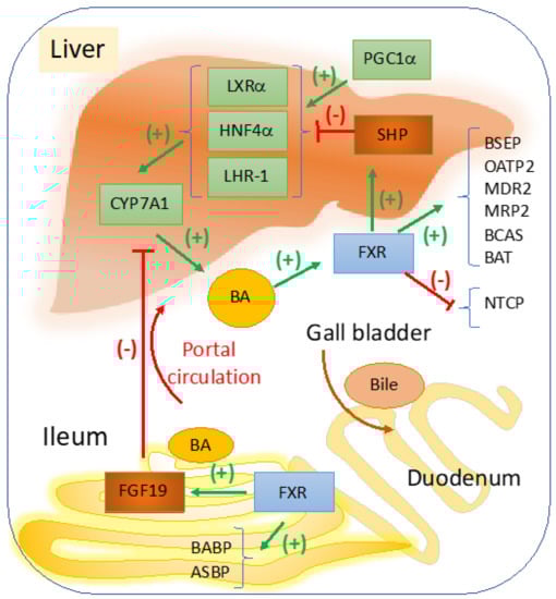 FXR regulation of bile acid synthesis, transport and hepato-enteric circulation. Cyp7a1 is the rate limiting enzyme in BA synthesis, and it is transactivated by LXRα, HNF4α, and LHR-1 which in turn are stimulated by various ligands derived from lipid nutrients including cholesterol (for LXRα), fatty acyl-CoA (for HNF4α), dietary phospholipids for LRH-1 or liver receptor homologue-1 [18,19]. When BA becomes abundant in the liver, a negative feedback loop starts to function via FXR to maintain balance and to control the elimination of excess BA. BA-induced activation of FXR results in upregulation of SHP which is a co-repressor of LXRα, HNF4α, and LHR-1. FXR upregulates genes with role in BA conjugation, i.e., BA CoA synthase (BCAS) and BA CoA: amino acid N-acetyltransferase (BAT). FXR mediates the bile formation and flow from the liver to the gallbladder by upregulating bile salt export pump (BSEP, ABCB11) which exports BA from hepatocytes; multidrug resistance associated 2 (MRP2, ABCC2) for the transport of BA amongst many other components of the bile into the gallbladder. Other proteins such as multidrug resistance protein 2 (MDR2), a transporter of phospholipids, and ABCG5, ABCG8 that transport cholesterol to the gallbladder are also upregulated by FXR. In the intestine, FXR transactivates ileum BA binding protein (IBABP) and mediates BA reabsorption by apical sodium-dependent bile salt transporter (ASBT). From portal circulation BA are reabsorbed into hepatocytes via sodium-dependent taurocholate cotransport peptide (NTCP), and organic anion transport protein 2 (OATP2). In the intestine, BA-activated FXR upregulates FGF19, a growth factor that is secreted into the portal circulation and inhibits Cyp7a1-controled BA synthesis in hepatocytes. BA synthesis is upregulated when BA concentration in the liver is low and SHP is replaced by PGC1α co-activator of genes that stimulate Cyp7a1 synthesis [11].