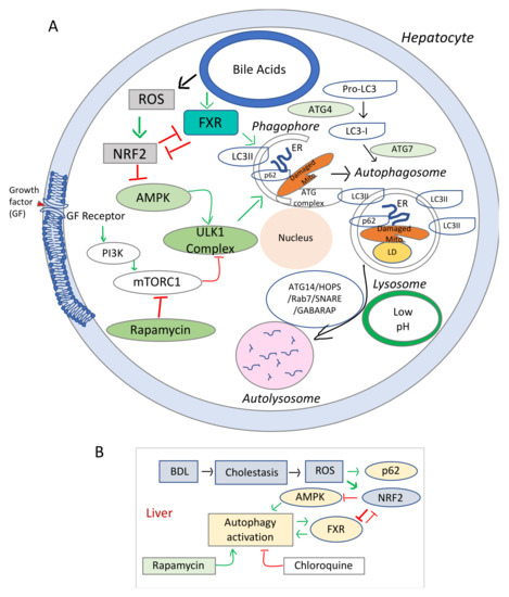 Diagram of signaling pathways involved in the dysregulation of autophagy and cell growth in cholestasis and liver fibrosis. (A), Schematic representation of the elements involved in the autophagy dysfunction in chronic oxidative stress. mTOR (mechanistic target of rapamycin) is a serine/threonine protein kinase, component of two distinct cellular complexes termed mTOR complex 1 (mTORC1) and mTORC2 where a multitude of signals such as nutrients, growth, energy are sensed and processed [114]. mTORC 1 downregulates autophagy (a catabolic process where macromolecules are sequestered in double membrane bound autophagosomes that fuse with lysosomes to allow their enzymatic breakdown). When there is sufficient energy, mTORC1 is active and through phosphorylation and destabilization of autophagy promoting complexes (ULK1 and other proteins), it ensures that autophagy is inhibited. During conditions of starvation, mTORC1 is inactive, it allows the phagosome to be formed. In addition, due to low energy level, AMPK gets activated and phosphorylates ULK1. Sequestome 1 (SQSTM1) or p62 is an active component of the autophagic process, and acts as a scaffold on lysosomal membranes for mTOCR1. During autophagy, p62 is incorporated into autophagosome and degraded, thus limiting mTORC1 activity. LC3 or microtubule-associated proteins 1A/1B light chain 3B is a biomarker of autophagosome. (B), Diagram of the interaction of cholestasis-induced ROS with autophagy in hepatocytes. While stimulating p62 and phagosome formation, ROS inhibit AMPK-mediated energy production needed for the autophagic flux, via NRF2 upregulation. Stimulation of autophagy by rapamycin and overexpression of FXR in autophagy-deficient cells counteract the effects of NRF2 reducing ROS-mediated hepatic damage.