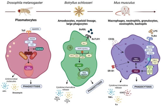 Molecular mechanisms guiding phagocytosis in different organisms. Although the phagocytic lineages and their molecular mechanisms guiding the process of phagocytosis could be different, they share several basic mechanisms with their ancestral form. Shown here: (left) the Toll pathway in Drosophila is activated by spaetzle, leading to an intracellular signaling that results in the degradation of cactus and the concomitant release of DIF/DORSAL which translocate to the nucleus and activate the transcription of immune genes including AMPs and drosomycin, which secreted as a response to infection [46]. (center) BsTLR1, Ras, MAPK, NFκB and cytokine homologs have been associated with the modulation of phagocytosis in B. Schlosseri. (?)—Represents missing functional or molecular validation. Similarly (right), mammalian TLRs are activated by microbial- and self-derived products leading to the activation of intracellular signaling cascade that results in the translocation of NFκB to the nucleus to activate the transcription of different cytokines and chemokines which enhance the phagocytic activity of the cells [47]. Created with BioRender.com.