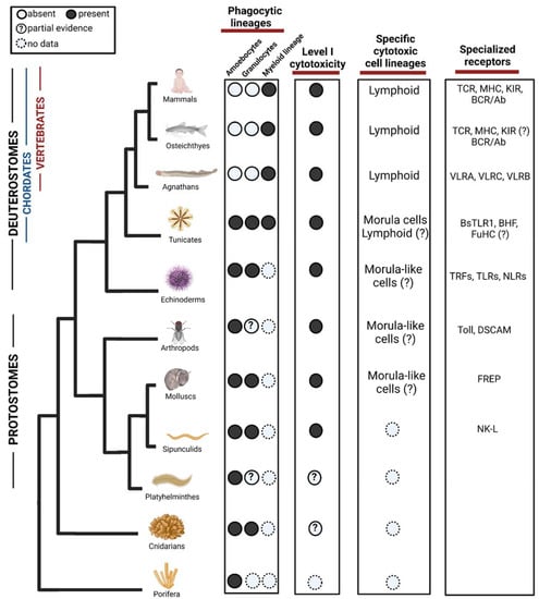 Evolution of phagocytic and cytotoxic cell lineages in the immune system. Among phagocytic lineages, amoebocytes and granulocytes are present in invertebrates, while myeloid lineage seems to evolve in the ancestor of tunicates and vertebrates. Cells representing the Level I cytotoxicity exist in Protostomes but might appear in cnidarian. Among specific cytotoxic cell lineages, morula cells have been found in tunicates although partial evidence suggests that they may evolve in earlier ancestors. Lymphoid cells are found in agnathans and have diversified in vertebrates, there are suggestions of their form in Tunicates but not validated yet. In the third column, we show examples of diversification of specialized receptors acting in both phagocytosis and cytotoxicity. TLR = Toll-like receptors, TCR = T-cell receptor, MHC = Major histocompatibility complex, KIR = Killer Inhibitory Receptors, BCR = B cell receptor, VLR = Variable lymphocyte receptor, BHF = Botryllus histocompatibility factor, TRF = Transformer proteins, NLR = NOD like receptors, DSCAM = Down syndrome cell adhesion molecule, FREP = Fibrinogen-related proteins, NK-L = Natural killer-like receptor. ?—Represents missing functional or molecular validation. Created with BioRender.com. Data sources are summarized in Table 1.