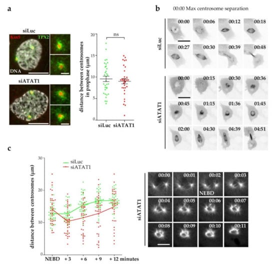 In prophase, starting roughly one hour before NEBD, the activity of kinesin-5 (KIF11/Eg5) regulates the optimal separation of centrosomes and insures the formation of an efficient bipolar spindle []. Centrosomal recruitment and activity of kinesin-5 depends upon TPX2 and NEK9 activity [] and its chemical inhibition by STLC or its downregulation results in the formation of monopolar spindles [,]. To analyze whether kinesin-5 activity might be hampered by the lack of MT acetylation, we measured the distance between centrosomes of prophase siLuc and siATAT1 cells. Centrosome separation before NEBD is not affected by loss of ATAT1, a finding confirmed by similar staining of the recruitment of both kinesin-5 and its regulator TPX2 to centrosomes (Figure 2a).