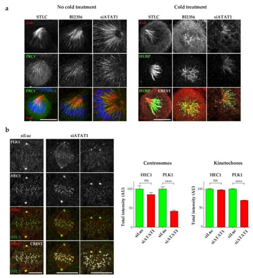 Next, BI2356, STLC, and siATAT1-treated cells were subjected to a brief cold treatment and fixed to visualize only the stable MT-kinetochore-fibers (K-fibers). HURP protein accumulation on K-fibers was reported to be inversely proportional to their length by a mechanism that is controlled by centrosomes []. In STLC-treated cells, a sharp and restricted region close to the plus end of the K-fibers was decorated by HURP. In contrast, HURP staining in both BI2356-treated and ATAT1-depleted cells extended very close to the MT minus end towards the centrosome region (Figure 4a, right panels). Thus, monopolar spindles induced in siATAT1 cells display striking similarities with PLK1-inhibited monopolar spindles.