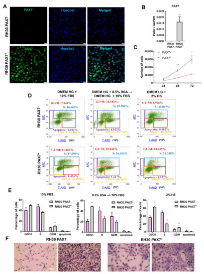 Firstly, differences in proliferation rate of RH30 subclones were detected. Counting the cells in standard conditions (DMEM HG medium with 10% FBS) revealed that PAX7− cells proliferated slower than RH30 PAX7+ cells (Figure 1C). Subsequently, we characterized cell cycle and BrdU incorporation in three different conditions: standard growth medium (DMEM HG with 10% FBS), standard medium preceded by a two-day starvation culture (0.5% BSA) and differentiation medium (DMEM LG with 2% HS). RH30 PAX7+ cells displayed higher percentage of the cells in G2/M phase than PAX7− cells, what suggests that they proliferate faster in standard growth medium. Analysis of the population of cells cultured in standard medium, but preceded by a two-day starvation culture showed higher percentage of PAX7+ cells in G0/G1 phase than PAX7−. Culturing under differentiating conditions in medium with 2% horse serum (HS) indicated also a higher percentage of PAX7+ cells in the G0/G1 phase and lower in S phase than PAX7− cells (Figure 1D,E), what suggests that PAX7+ cells might be more sensitive to starving differentiating conditions that may induce cell cycle arrest. Nevertheless, other explanations cannot be excluded.