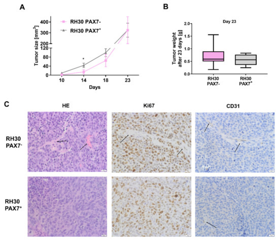 To evaluate proliferation not only in vitro, tumor growth was also estimated in vivo after subcutaneous injection of the cells to immunodeficient NOD-SCID mice. The differences in tumor size were observed only until 14 days after implantation. RH30 PAX7+ cells more quickly started to form measurable tumors and possibly therefore they formed bigger tumors 14 days after implantation, but those differences disappeared in the next days (Figure 2A). Nevertheless, at the last day of the experiment, the growth and size of tumors in case of PAX7− cells seemed to be more heterogeneous than in case of PAX7+ cells, due to the greater dispersion of the obtained results of measurements of the size and weight of tumors (Figure 2A,B). Those results may suggest that PAX7− cells may be more sensitive to external conditions and tumor microenvironment, as previous studies suggested that tumor microenvironment may contribute in confounding ways to tumor progression and heterogeneity [13,35]. Additionally, tumors formed by RH30 subclones displayed only slight differences in tumor morphology, Ki67 level and CD31 positive blood vessels (Figure 2C).