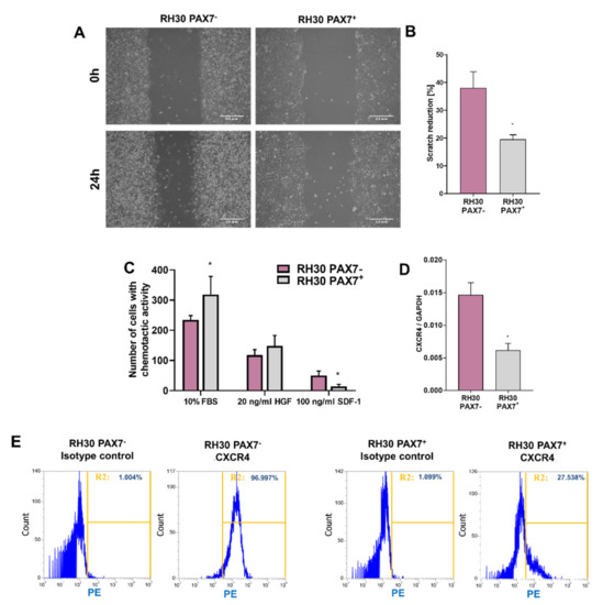 Because for tumor progression not only proliferation, but also migratory capabilities of the cells are important, migration of the cells was estimated in a scratch assay. After 24 h, there were differences in closing a gap in a monolayer of the cells between PAX7+ and PAX7− cells in starving conditions (Figure 3A,B). After testing the migratory capacity of RH30 PAX7− and PAX7+ cells, their abilities to respond to specific chemoattractants were also tested. The number of RH30 PAX7+ cells migrating towards FBS gradient tended to be higher, and for SDF-1 lower compared to PAX7− cells. The greater ability of PAX7− cells to migrate in response to SDF-1 may result from a higher level of expression of CXCR4 receptor at mRNA (Figure 3D) and protein levels (Figure 3E), validated by qPCR and flow cytometry, respectively. No differences were observed in the number of HGF-responsive RH30 PAX7− cells and PAX7+ cells (Figure 3C).
