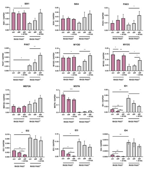 RH30 PAX7− and PAX7+ subclones displayed differences in expression levels of transcription factors that regulate myogenic differentiation. RH30 subclones undifferentiated (ctrl) and differentiated in DMEM LG medium with 2% HS without or together with ATRA differed in expression levels of myogenic transcription factors and ID factors, n = 3. mRNA expression levels were evaluated with qPCR. Data were calculated with 2−ΔCt method using GAPDH as a constitutive gene. The data on graphs show means ± SEM. * p < 0.05, ** p < 0.01, *** p < 0.001.
