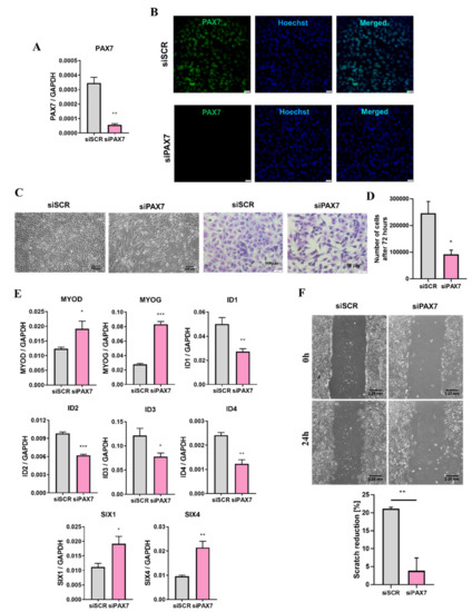 Silencing of PAX7 transcription factor in RH30 PAX7+ subclone enhanced myogenic differentiation, and inhibited proliferation and migration. (A) PAX7 mRNA level was downregulated after transfection of RH30 PAX7+ cells with siRNA (siPAX7) and control cells were modified with scrambled siRNA (siSCR), n = 3. (B) PAX7 protein silencing was visualized with immunofluorescent staining and representative images are shown (green—PAX7, blue—nuclei, Hoechst). White scale bar represents 20 μm. (C) PAX7 silencing in RH30 cells induced elongation of the cells and diminished their growth three days after transfection. Representative images of phase contrast (scale bar—100 μm) and Wright’s staining (scale bar—50 μm) are shown. (D) PAX7 silencing in RH30 cells diminished proliferation 96 h after transfection. The cells were seeded 24 h after transfection and then counted using Bürker chamber after the next 72 h, n = 3. (E) PAX7 silencing upregulated MYOD, MYOG, SIX1, and SIX4 levels, whereas downregulated ID1, ID2, ID3, and ID4 levels. mRNA expression levels were evaluated with qPCR. Data were calculated with 2−ΔCt method using GAPDH or as constitutive genes, n = 3–4. (F) PAX7 silencing in RH30 cells diminished motility of the cells in a scratch assay. Representative images are shown (scale bar—250 μm) and graph with calculated scratch reduction, n = 3. The data on graphs show means ± SEM. * p < 0.05, ** p < 0.01, *** p < 0.001.