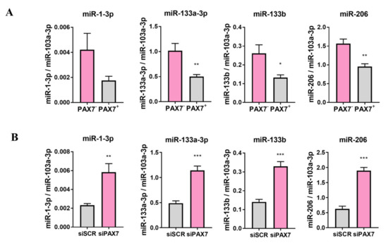 PAX7 transcription factor regulated expression levels of myogenic microRNAs in RH30 cells. (A) miR-1-3p, miR-133a-3p, miR-133b, and miR-206 expression levels were increased in RH30 PAX7− subclone compared to RH30 PAX7+ subclone. (B) PAX7 silencing with siRNA in RH30 PAX7+ subclone upregulated miR-1-3p, miR-133a-3p, miR-133b, and miR-206 expression levels. miRNA expression levels were evaluated with qPCR, n = 3. Data were calculated with 2−ΔCt method using miR-103a-3p as constitutive genes. The data on graphs show means ± SEM. * p < 0.05, ** p < 0.01, *** p < 0.001.