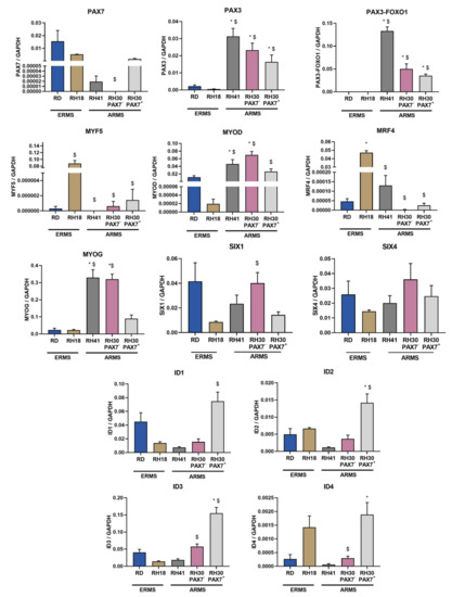 However, here the observed reverse pattern of expression for myogenic factors: PAX7, PAX3, MYOD, and MYOG, may be not related to a specific RMS subtype, but rather be a result of the presence or absence of the PAX3-FOXO1 fusion gene. We found that ERMS cells used in our research were negative for PAX3-FOXO1 fusion, in comparison to ARMS lines, positive for the genes fusion. These results are consistent with the literature data on the RMS lines [67]. There are studies showing that PAX3-FOXO1 induces the expression of the gene for PAX3, while it lowers the level of PAX7 expression [84]. In contrast, MYOG expression can be induced by PAX3-FOXO1 via a MYOD-independent pathway in ARMS cells [85].