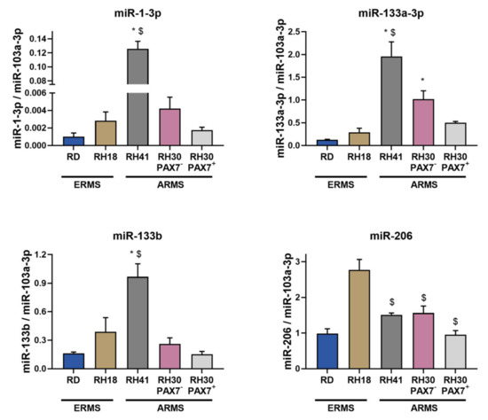 Myogenic microRNAs were differentially expressed in ERMS and ARMS cells. miR-1-3p, miR-133a-3p, miR-133b, and miR-206 expression levels were calculated with 2−ΔCt method using miR-103a-3p as a constitutive gene. The data on graphs show means ± SEM, n = 3–4. Statistical analysis was performed with ANNOVA with Tukey posttest to analyze differences between ERMS and ARMS cell lines. Two types of differences were shown. * symbol indicates statistically significant differences compared to RD ERMS cell lines (p < 0.05), whereas $ symbol designates statistically significant differences compared to RH18 ERMS cell line (p < 0.05).