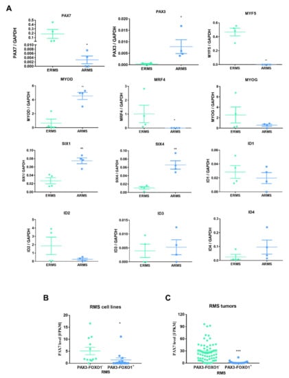 Transcription factors regulating myogenic differentiation were differentially expressed in ERMS and ARMS tumors in patients. (A) mRNA expression levels of different genes were evaluated with qPCR in four ERMS and four ARMS tumor samples from patients. Data were calculated with 2−ΔCt method using GAPDH as a constitutive gene, n = 4. (B) PAX7 level in FPKM in 25 cell RMS lines positive and negative for PAX3-FOXO1 fusion extracted from the literature table results published by Gryder et al. 2017 [32] were reanalyzed and presented as dot plots. PAX7 level was diminished in ARMS cells positive for PAX3-FOXO1 fusion. (C) PAX7 level in FPKM in 90 RMS tumor samples positive and negative for PAX3-FOXO1 fusion extracted from the literature table results published by Gryder et al. 2017 [32] were reanalyzed and presented as dot plots. PAX7 level was diminished in RMS tumors positive for PAX3-FOXO1 fusion. The data on graphs is shown as dot plots with means ± SEM * p < 0.05, ** p < 0.01, *** p < 0.001.