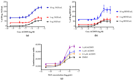 Both Toltrazuril and Ponazuril are registered veterinary products prescribed for parasitic infections in animals [59,60,61,62,63]. Ponazuril was chosen as the lead candidate for repurposing [64] based upon its pharmacokinetic properties [65], the lack of further oxidation on the sulfur-linker, convincing existing safety pharmacology and toxicology data [66], a promising pharmacological modulation of TrkA and TrkB-signaling, and it was renamed to the internal name ACD855. Interestingly, Diclazuril, another triazine-containing compound, was not active in the TrkA or TrkB assays (Supplemental Figure S3). ACD855 could effectively potentiate the response of NGF or BDNF in TrkA- or TrkB-overexpressing cell lines, respectively (Figure 2a,b). The cellular response to NGF or BDNF was measured using PathHunter® assays employing β-gal enzyme fragment complementation technology. The activation of Trk-receptors leads to an intracellular interaction between the Trk-receptor and SHC-1 and thereby to the complementation of β-gal, which will render in a functional enzyme. β-gal will hydrolyze a substrate to generate luminescence, which is proportional to the number of activated receptors. Figure 2a,b demonstrates that ACD855 by itself could activate both TrkA- and TrkB-receptors to 45% without ligand when using U2OS cells overexpressing TrkA or TrkB. Moreover, using neurotrophin concentrations (10 ng of NGF or BDNF /mL) that produced almost full activation, ACD855 could activate both pathways even further with an EC50 of 1.9 ± 0.4 or 3.2 ± 1.2 µM (mean ± SEM, n ≥ 5) for TrkA (Figure 2a) or TrkB (Figure 2b), respectively. Activation of TrkA or TrkB with 30 ng/mL of ligand was set as 100% activation since no further increase in receptor activity was observed beyond 30 ng/mL. Interestingly, ACD855 could potentiate the activation of Trk-receptors beyond 100%, suggesting that there are mechanisms to further increase the kinase activity of the Trk-receptors. We have previously reported that the activation of TrkA beyond 100% is possible when using PathHunter® assays. For instance, a double mutant of NGF, NGF-K95A/Q96A, could activate the TrkA receptor to a higher degree than NGF itself [55]. We could also demonstrate that ACD855 positively modulated TrkA activity when tested at three different concentrations (0.3, 1 and 3 µM), together with a wide range of NGF concentrations, as judged by Figure 2c, depicting the NGF dose–response curves in the absence or presence of increasing concentrations of ACD855.