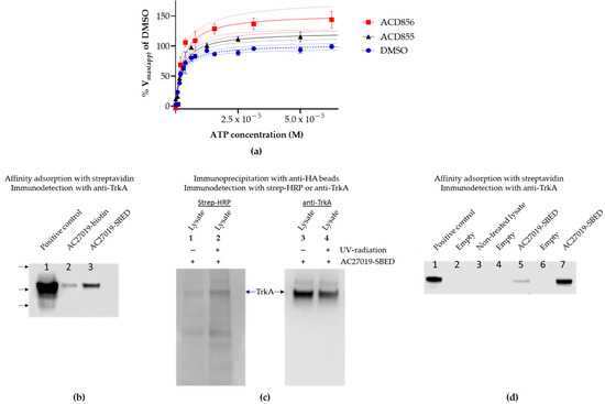 Mechanism of action of triazinetriones on TrkA. (a) Full-length TrkA with a HA-tag (TrkA-HA) fused to the C-terminus was purified through immunoprecipitation using anti-HA agarose beads. Purified TrkA-HA was incubated with DMSO (blue circles and hatched line), ACD855 (5 µM) (black triangles and solid line), or ACD856 (1 µM) (red squares and solid line) for approx. 5 min. Thereafter, ATP was added to yield the indicated concentration. Each data point is the mean ± SEM (n = 3). The solid lines are the curve-fit using the Michaelis–Menten equation used to calculate the apparent Vmax(app) and km(app), and the dotted lines are the 95% confidence band for each curve fit. (b–d) Affinity labeling and streptavidin adsorption of Trka. (b) Western blot of streptavidin adsorbed TrkA-HA non-covalent labeled with NHS-biotinylated triazinetrione compound (lane 2) or covalent labeled by UV-crosslinking of 100 µM sulfo-SBED biotinylated compound (lane 3). Detection of immunoreactive band was performed with anti-TrkA antibody. Supernatant loaded to the left (lane 1) was used as positive control for the Western blot. Arrows on the left indicate the migration of molecular weight markers corresponding to 198, 98, and 62 kDa. (c) Anti-HA agarose immunoprecipitation of cross-linked or non-crosslinked sulfo-SBED compound (AC27019-SBED) from cell lysate incubated with 100 µM AC27019-SBED. Lane 1, non-UV-crosslinking, and lane 2, UV-crosslinking of sulfo-SBED labeled TrkA-HA, both detected with streptavidin-HRP. Lanes 3 and 4 are loading controls of lanes 1 and 2, respectively, were TrkA-HA was detected by immunoblotting using the anti-TrkA antibody. Both blots were part of the same gel, but the membrane was cut in two pieces, and the proteins were detected by streptavidin-HRP (left panel) or by an anti-TrkA antibody (right panel). (d) Streptavidin adsorption of biotinylated compound bound to TrkA-HA. Lane 1, cell lysate used for positive control of immunodetection; lane 3, cell lysate without biotinylated compound was adsorbed to streptavidin-agarose as negative control; lanes 5 and 7, cell lysates containing sulfo-SBED compound UV-crosslinked to TrkA (from two different experiments) were adsorbed to streptavidin-agarose and immunoblotted using anti-TrkA antibody. Lanes 2, 4, and 6 are empty lanes to avoid cross-contamination between lanes.