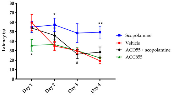 Effects of ACD855 in the Morris water maze. Subsequent to the pretraining, four days of spatial training in the water maze took place, whereby the animals received four daily trials starting at four different starting points around the water tank. Time to locate the platform (latency) was measured. Vehicle-treated animals (red line and circle) learned the task rapidly, while scopolamine- (0.3 mg/kg) treated animals (blue line and squares) had a highly significant impairment in swim latency, (* p < 0.05 (Day 2) and ** p < 0.01 (Day 4); respectively) in comparison to the control group. ACD855 (3 mg/kg) completely blocked the impairing effect of scopolamine on swim latency (black line and diamonds) (# p < 0.05 (Day 3)). ACD855 on its own improved cognitive function compared to vehicle, as there was rapid learning exhibited on Day 1 that significantly differed from the control animals (green line and triangles) (* p < 0.05 (Day 1)).