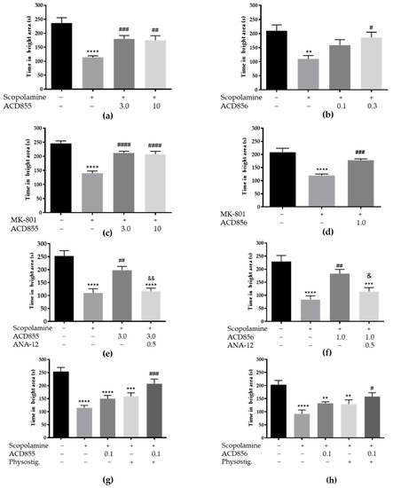 ACD855 or ACD856 reverses memory-impairment in the passive avoidance task in mice. ACD855 (3 or 10 mg/kg) was administered s.c. for 4 consecutive days, whereas ACD856 (0.1, 0.3 or 1 mg/kg) was administered as a single dose 60 min prior to the experiment in combination with scopolamine (0.3 mg/kg, s.c.), MK-801 (0.3 mg/kg, i.p.), ANA-12 (0.5 mg/kg, s.c), or physostigmine (0.0125 mg/kg, s.c). Memory was assessed by measuring the total time the animals spent in the bright compartment, the maximum being 300 s. (a,b) ACD855 or ACD856 reversed scopolamine-induced memory impairment at the indicated doses. ** p < 0.01 or **** p < 0.0001 for scopolamine vs. the control group. #### p < 0.0001, ## p < 0.01, or # p < 0.05 for compound and scopolamine-treated animals vs. the scopolamine-treated group. (c,d) ACD855 or ACD856 reversed MK-801 induced memory impairment at the indicated doses. **** p < 0.0001 for MK-801 vs. the control group. ### p < 0.001 or ## p < 0.01 for compound- and MK-801-treated animals vs. the MK-801-treated group. (e,f) ANA12 inhibited ACD855- or ACD856-induced memory improvement. Animals were treated with scopolamine, ACD855 or ACD856 or ANA-12 as indicated (mg/kg). **** p < 0.001 for scopolamine vs. the control group. ## p < 0.01 for ACD855- and scopolamine-treated animals vs. the scopolamine-treated group, & p < 0.05 or && p < 0.01 for 855 and scopolamine- treated animals vs. ANA-12-, ACD855-, and scopolamine-treated group. (g,h) Physostigmine and ACD855 or ACD856 acted in an additive manner to reverse scopolamine-induced impairment. **** p < 0.0001 for scopolamine vs. the control group. **** p < 0.0001 or ** p < 0.01 for scopolamine + physostigmine vs. the control group. *** p < 0.001 or ** p < 0.01 for scopolamine + ACD855 or ACD856 vs. the control group and ### p < 0.001 or # p < 0.05 for scopolamine-, ACD856-, and physostigmine-treated animals vs. the scopolamine-treated group.