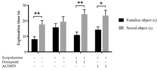 Effects of ACD855 and donepezil on object recognition in Wistar rats. ACD855 was administered for 4 consecutive days using 1 mg/kg, whereas donepezil was administered 30 min before the trial, both in combination with 1 mg/kg scopolamine. Groups treated with scopolamine and donepezil or ACD855 spent significantly greater time with the novel object. Black bars indicate familiar object and grey bars indicate novel object. ** p < 0.01 or * p < 0.05 for time spent on novel objects vs time spen on familiar objects.
