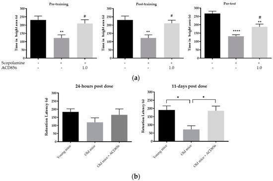 ACD856 improves the acquisition, consolidation, and retrieval of memories. (a) Effects of ACD856 on acquisition, consolidation, or retrieval on scopolamine-induced amnesia in the passive avoidance model. The memory was assessed by measuring the total time that the animals spent in the bright compartment, the maximum being 300 s. Vehicle or ACD856 were administered as a single dose by subcutaneous (s.c.) injection (4 mL/kg body weight) at different timepoints in relation to the training session. On the day of training (Day 1), ACD856 or vehicle was administered either 60 min prior to training (pre-training, left graph) or 5 min post-training (post-training, middle graph). When evaluating the effects on the retrieval of memories on day 2, either vehicle or ACD856 was administered 30 min before the test session (pre-test). On the day of training, scopolamine at 0.3 mg/kg, or vehicle was administered subcutaneously 30 min prior to training. ** p < 0.01 or **** p < 0.0001 for scopolamine- vs. the vehicle-treated group (black bars). # p < 0.05 for compound and scopolamine-treated animals vs. the scopolamine-treated group. (b) ACD856 reversed aged-induced memory impairment at 24-h and 11 days post-dose. Left panel, the old mice displayed lower retention latency than the young mice, but it was not statistically significant. A single injection of ACD856 at a dose of 3 mg/kg induced a slight increase in retention latency in comparison to vehicle-treated old mice. Right panel, the retention latency was significantly higher in control young mice and the ACD856-treated group with old animals in comparison to the old control group when tested 11 days after the first retention test (* p < 0.05).