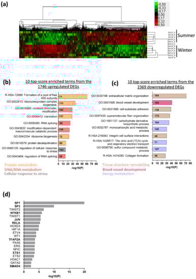 Deep changes in brown bear muscle transcriptome during hibernation. (a) Heatmap from brown bear muscle (vastus lateralis) transcripts (n = 6 bears/season, the same individuals were sampled and analyzed in summer and winter); red indicates high and green indicates low expression level of the 13531 genes. (b) Graph representing the 10 top-score of significantly enriched terms in winter compared to summer, from the 1746 up-regulated differentially expressed genes (DEGs) (FC W/S >|1.3| and padj < |0.01|) or (c) from the 2369 down-regulated DEGs (FC W/S < |0.77| and padj < |0.01|; Table S1). The color code for the functional cluster is indicated in the respective graphs, and the bold numbers in the different bars represent the numbers of DEGs found in the enriched terms. (d) Graph representing the 10 top-score of transcription factors involved in DEGs regulation from “Formation of a pool of free 40S subunits” and “Extracellular matrix organization” enriched terms. The bold TFs are involved in TGF-β superfamily regulation.
