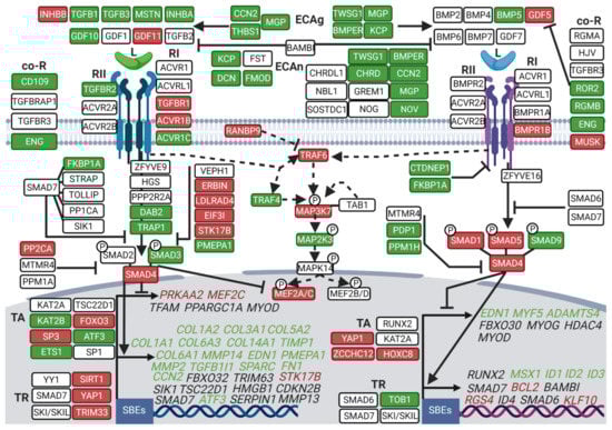 Deep transcriptomic reprogramming of TGF-β and BMP pathways in muscle during brown bear hibernation. Scheme showing brown bear vastus lateralis muscle transcripts involved in TGF-β and BMP signaling and depicting (i) their relationships [,,] and (ii) the difference in their expression levels between hibernation and activity periods. Red and green boxes indicate, respectively up- and down-regulated genes during hibernation compared to the summer season, and white boxes indicate unchanged genes. Target genes of the TGF and BMP pathways are indicated in italic and are in green when down-regulated, in red when up-regulated, and in black when unchanged. Dashed lines show the SMAD-independent pathway and full lines the canonical signaling pathway. Arrows indicate activation, and ⊥ bars indicate inhibition. (n = 6 bears/season, the same individuals were sampled and analyzed in summer and winter, padj < |0.05|; Tables S2 and S3). ECAg: Extracellular Agonist, ECAn: Extracellular Antagonist, L: Ligand, Co-R: Co-Receptor, RII: Receptor type II, RI: Receptor type I, TA: Transcriptional Activator, TR: Transcriptional Repressor, SBEs: SMAD Binding Element. Created with BioRender.com.
